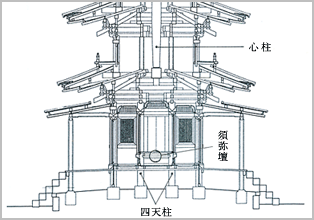 五重塔としては海住山寺五重塔が心柱を初重天井上に立てた最初の現存例であり、以後は心礎上に立てるものと天井上に立てるものとがほぼ半々になります。海住山寺五重塔の場合は、規模が小さいため内部を広く使えるように心柱を天井上に立てたのではなく、仏舎利を納めた舎利塔を中心に安置して四方どこからも礼拝できるようにするためであったと考えられます。